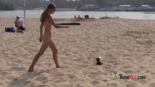 Slim teen with perky boobs naked at a nudist beach