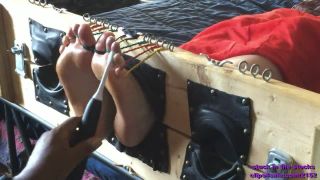 This is the full-size view of best friends Robin and Brandi locked side by side in the stocks, and tickled silly! Brandi kind of enjoys being tickled, while Robin–well, lets just say for Robin, having her feet tickled is something close to the worst torment she can imagine! Also, while their outside hands are restrained to the outside edges of the bed, their inside hands (next to each other) are free, so occasionally you may see them flailing about (and hitting each other)! Robin has her own clip store elsewhere, so she doesnt mind when her face pops into frame, and you may see it once or twice, with an ear-to-ear “Im being tickled out of my mind” grin on her face! And of course, the big size ten feet of both girls get a good working over!