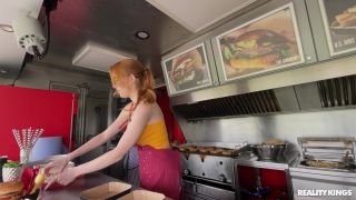 Redhead foodie Scarlett Jones finally achieved her lifelong dream of owning her own food truck. Shes got the perfect location and her famous recipes, but she also has a nip slip as one of her big tits falls out of her tank top as she waits for customers! Soon Scarlett is swamped with orders, and luckily her buddy Charlie Dean stops by to help out. After the rush is over, Scarlett thanks Charlie with a blowjob, and he devours her delicious pussy on the counter before slipping her his sausage. Scarlett gets fucked on the counter, then tastes Charlies special sauce.